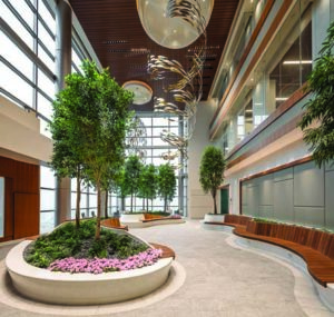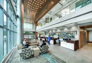 Parkview Cancer Institute in Fort Wayne, Ind., is a standalone outpatient cancer facility designed to minimize the feeling of being in a hospital while still providing expert care. Project design firm HKS (Dallas) relied on patient feedback for the design of the project, completed in June 2018. This includes “care pods” comprising exam and consultation space where specialists come to the patient in a single appointment, eliminating the need to go back and forth between various offices and locations. A three-story indoor garden off the lobby houses natural vegetation and two large hanging art installations inspired by leaves blowing through the wind, with glass balconies above offering views to the setting for patients in the infusion area and treatment spaces. To improve care delivery, a separate entrance and registration area is designed for radiation patients to make their visits more efficient, while a dedicated room with advanced technology allows the care team to meet either in person or wirelessly to discuss a patient’s case and develop a comprehensive treatment plan.