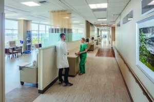 Opening in July 2018, Clovis Community Cancer Institute in Clovis, Calif., offers a comprehensive cancer center with exam rooms, a 53-chair infusion center, MRI, CT, PET CT, and linear accelerators alongside research and lab spaces. During design of the 95,000-square-foot project, the team, including architecture and interior design firm SmithGroup (San Francisco) with associate architect Muratore Associates (Fresno, Calif.), interviewed physicians, nurses, staff, and patients, determining that open treatment spaces would support the center’s communal culture and help foster the social support networks that informally develop during infusion treatments. As a result, infusion treatments are delivered in social spaces with four- or eight-chair arrangements so patients face one another to facilitate conversations. In order to keep these larger spaces still feeling comfortable and not overwhelming, the clinical staff support infrastructure is located outside the treatment space, with sinks, supply drawers, waste receptacles, sharps containers, etc., just out of eyesight of patients seated in an infusion chair.