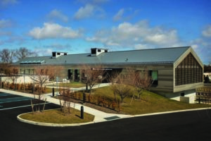 Stony Brook Southampton Hospital’s Phillips Family Cancer Center, part of the Stony Brook University Cancer Center in Southampton, N.Y., provides radiation therapy and medical oncology services. The design team, including Blaze Makoid Architecture (Bridgehampton, N.Y.) and contractor EW Howell Construction Group (Plainview, N.Y.), took inspiration from the site’s history as a potato barn, incorporating a long, rectangular and pitched roof and composite wood plank siding that’s reminiscent of aged cedar on the exterior of the 13,800-square-foot, two-level building, which was completed in May 2019. The radiation treatment area is located on the ground floor, incorporating a 22,000-pound leaded cantilevered concrete door and prefabricated leaded concrete walls in the vault. On the second-floor infusion area, a cathedral ceiling features skylights above 12 individual treatment stations with glass dividers depicting soothing images of waving dune grasses between the stations.