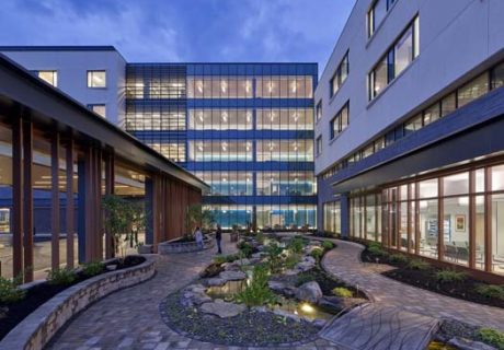 The 140,000-sq.-ft., 5-story ACB provides a platform for numerous clinical specialties, providing a more convenient patient experience and bringing more visits to the campus. At the core of the program is an emphasis on oncology and ambulatory surgery, which defines a duality of purpose and image for the building. Oncology services include an Infusion Center with rooftop garden, radiation oncology, and a Women’s Center for imaging and treatment. The ASC includes eight operating rooms, dedicated sterile processing, and 27 prep/recovery positions. Other programs include various specialty practices, a sleep lab, cardiac rehabilitation gym, and conference center.