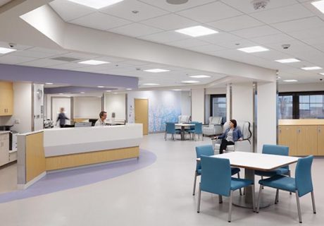 The main treatment room features 12 recliners with 110 square feet of clear area dedicated to each recliner in a communal setting, providing patients with the freedom to move about the room and interact without confinement or restraint. An open provider station helps the staff and patients feel unified and partnered rather than separated during treatment. Furthermore, to encourage socialization and avoid patient degradation that’s often related to isolation, care is delivered in the open treatment area instead of assigned patient rooms.