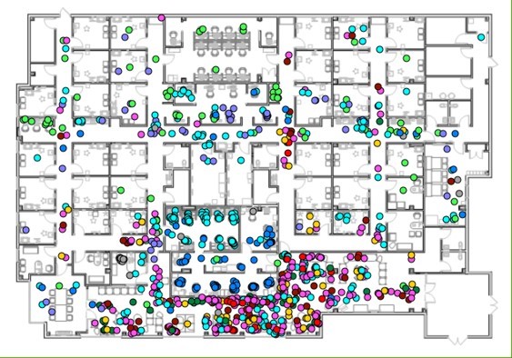 This depicts a visual snapshot of EwingCole’s proprietary tool, DOTT®, used to map how families use different spaces to assess the functional performance of a pediatric clinic. Courtesy of EwingCole