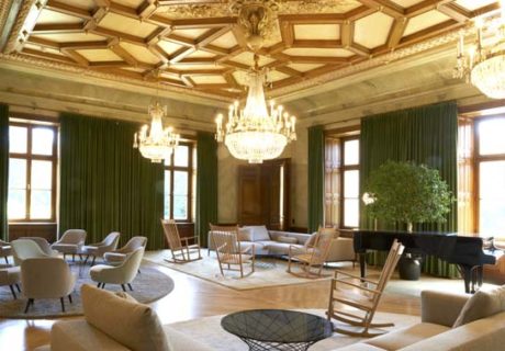 For example, the former knight’s hall, housing opulent chandeliers and marble walls, serves as a lounge with varying furnishings to accommodate different groups or seating preferences. The facility also houses therapy rooms, a restaurant, and 80 private patient rooms, while views of surrounding nature and the property, which includes a moat, were also incorporated into the design.