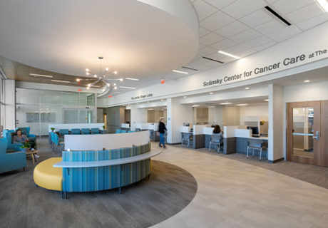 The 22,000-square-foot Solinsky Center for Cancer opened in August 2020 on the Elliot Hospital campus and consolidates chemotherapy, radiation oncology, medical oncology, and other holistic services into one space. This adjacency between disciplines improves communication between physicians and support staff, and now provides patients with everything they might need from diagnosis through recovery all within the Elliot campus.